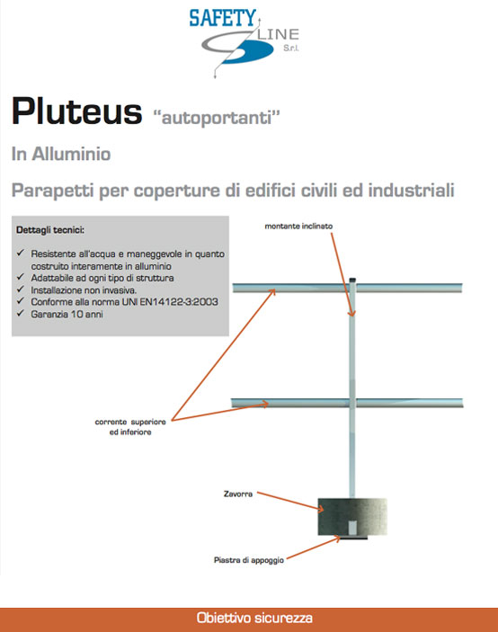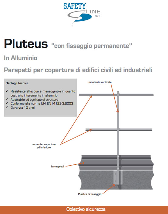 In risposta a tali problematiche la Safetyline srl, dopo aver proposto sul mercato le sue linee anticaduta ha concepito un sistema di protezione collettiva chiamato PLUTEUS, con l’intento di fornire ai progettisti e utilizzatori una serie di elementi di protezione multifunzionali, adatti per ogni tipo di copertura.