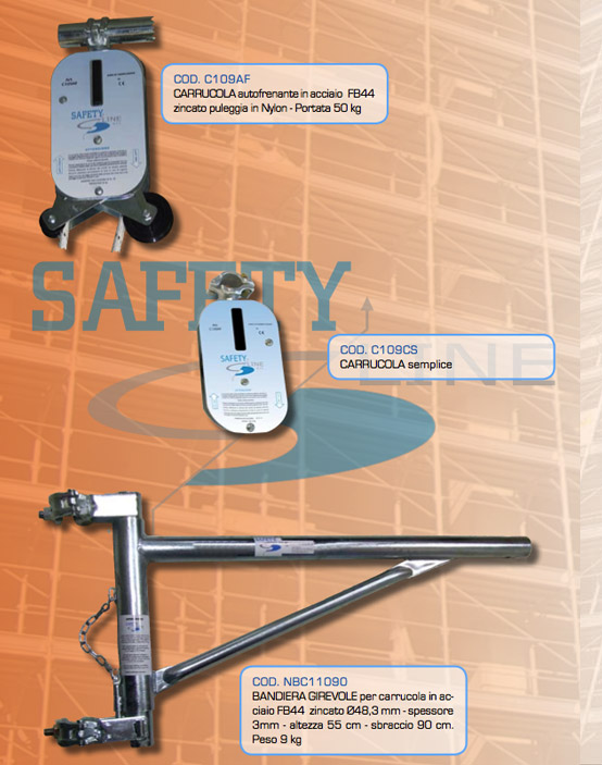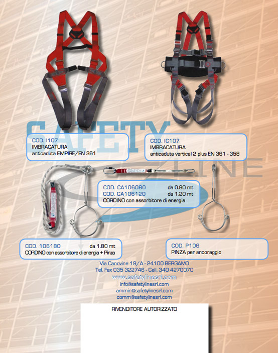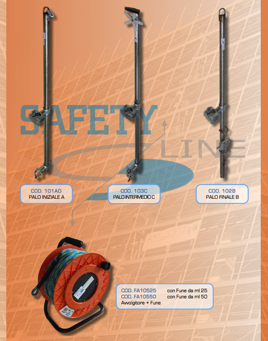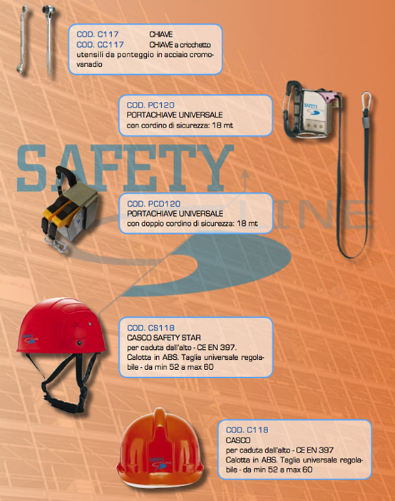 La linea vita per ponteggi della SAFETY LINE srl ( safety line ) è un DPI ( Dispositivo di Protezione Individuale ) di terza categoria ( destinato alla salvaguardia delle cadute dall'alto ) ed è pertanto conforme alla direttiva 89/686/CEE ( D.Lgs. 4 dicembre 1992 n° 475 ). La normativa di riferimento seguita per la progettazione della Safety line è la EN 795:1996 classe C + l'appendice A1:2000 della norma, le linee guida ISPESL, l'art. 115 D.lgs. 81/08 e l'ex art. 10 D.P.R. 164/56.