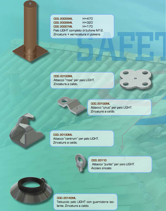 La Safetyline srl ha concepito il sistema LIGHT, con l’intento di fornire alle e utilizzatori una serie di elementi multifunzionali, completi di ancoraggi strutturali per varie superfici, quali, legno, calcestruzzo, strutture in acciaio.